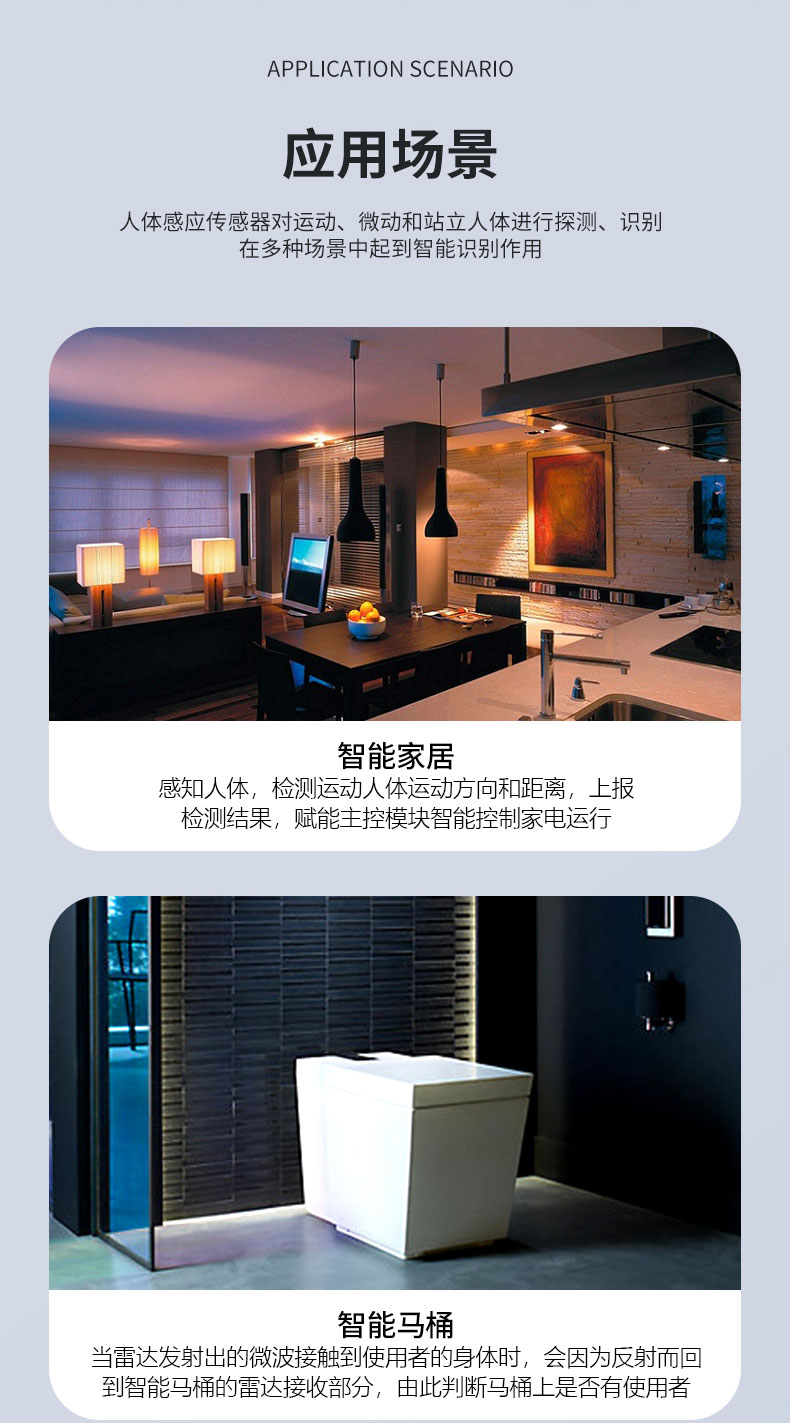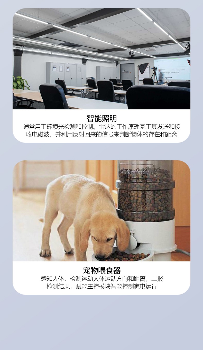 FR58L4LS-2020M-2 簡稱 2020M 是飛睿智能推出的高性能低功耗 5.8G 雷達傳感器,雷達模塊利用多普勒原理,通過天線發(fā)射高頻電磁波并接收初期反射波,以此判斷覆蓋范圍內(nèi)物體的移動,給出相應電信號。模塊尺寸 20*20MM,該模塊集成了 5.8G 微波電路、中頻放大電路以及信號處理器,集成度高且生產(chǎn)一致性好,模塊內(nèi)置32 位 MCU 和收發(fā)天線,大大提高了傳感器的感應性能。雷達模塊感應距離遠、角度廣、無死區(qū)、透鏡和透鏡老化問題不受溫度、濕度、氣流、灰塵、噪聲、亮暗等影響。模塊內(nèi)植入濾雨樹葉算法,能過濾掉雨水樹葉的誤觸發(fā),性能穩(wěn)定,廣泛應用于智慧照明、智慧安防等多個領域。