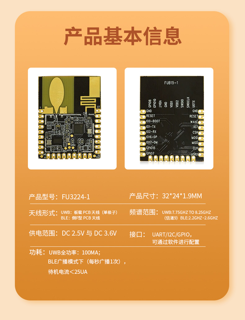 FU3224-1 UWB-BLE 模組是基于 UWB 芯片與 BLE5.3 芯片設(shè)計的一款智能綜合性模組,搭載 1 單元 PCB 高性能單極子 UWB 天線,1 單元倒 F 藍(lán)牙天線。